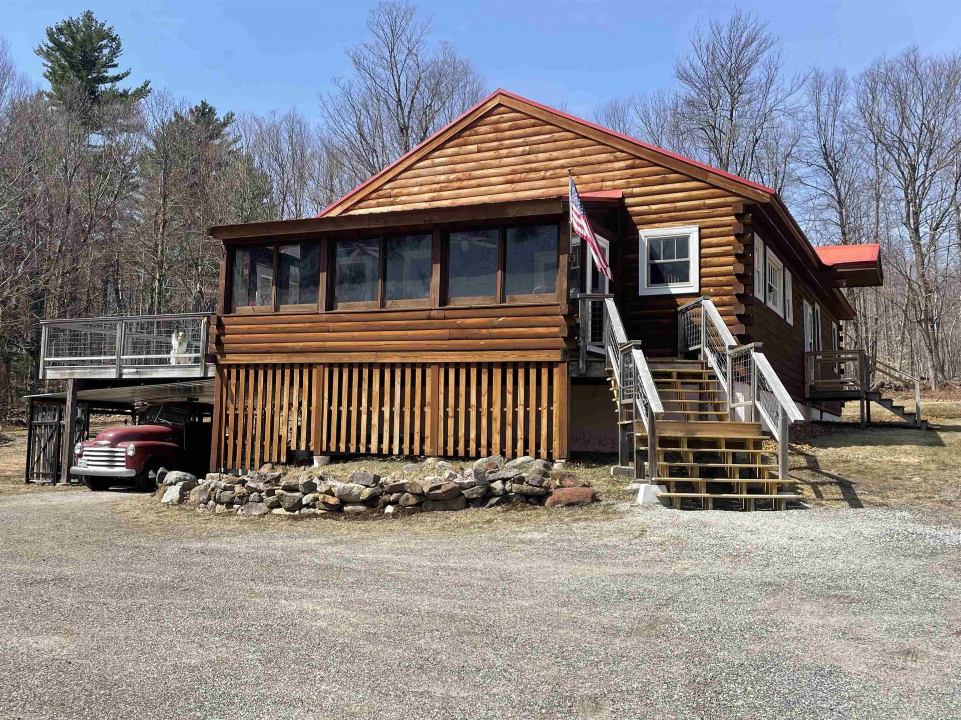 Coming soon. Delayed Showings, Showings starting Saturday the 18th 9 AM Welcome to your own private oasis. This exceptional log cabin is set on 6.9 peaceful acres and offers the perfect opportunity for a full time residence or a stunning getaway retreat. Located in the charming town of Stoddard, the property provides year round enjoyment with access to a town beach and boat ramp for summer fun, nearby snowmobiling trails, and close proximity to ski mountains for winter recreation. The home is in excellent condition and is accompanied by a large barn with an oversized carport. This versatile space can easily serve as a full garage, workshop, horse barn, or accommodate other animals or hobbies. Inside, the beautiful kitchen features custom cabinetry crafted from curly maple lumber harvested directly from the property. A Rev A Shelf organization system ensures easy access and functionality, and all appliances are included. Additional highlights include an expanded deck with covered carport and wood storage below, a fully fenced dog friendly backyard, and a charming screened farmer's porch. The porch is equipped with removable plexiglass panels, allowing for comfortable use during the winter months. For added convenience, the home also features a wood waiter elevator running from the basement to the first floor, making it effortless to transport firewood for cozy evenings by the fire.